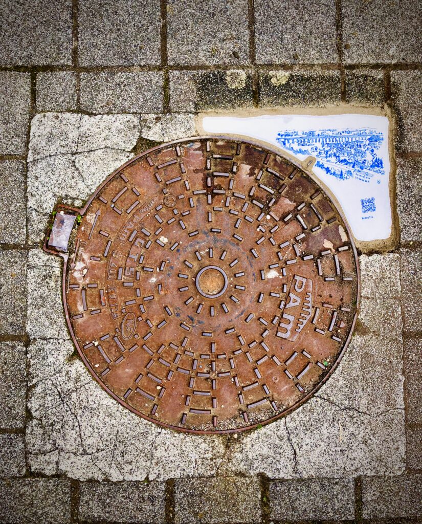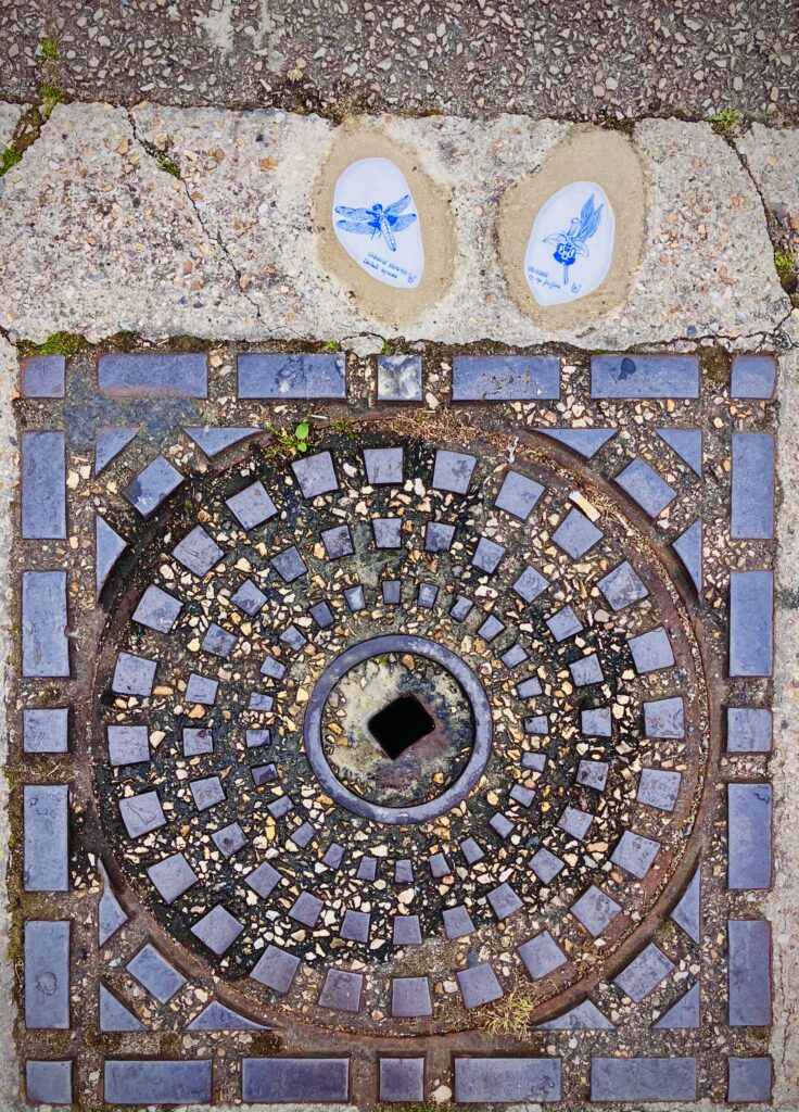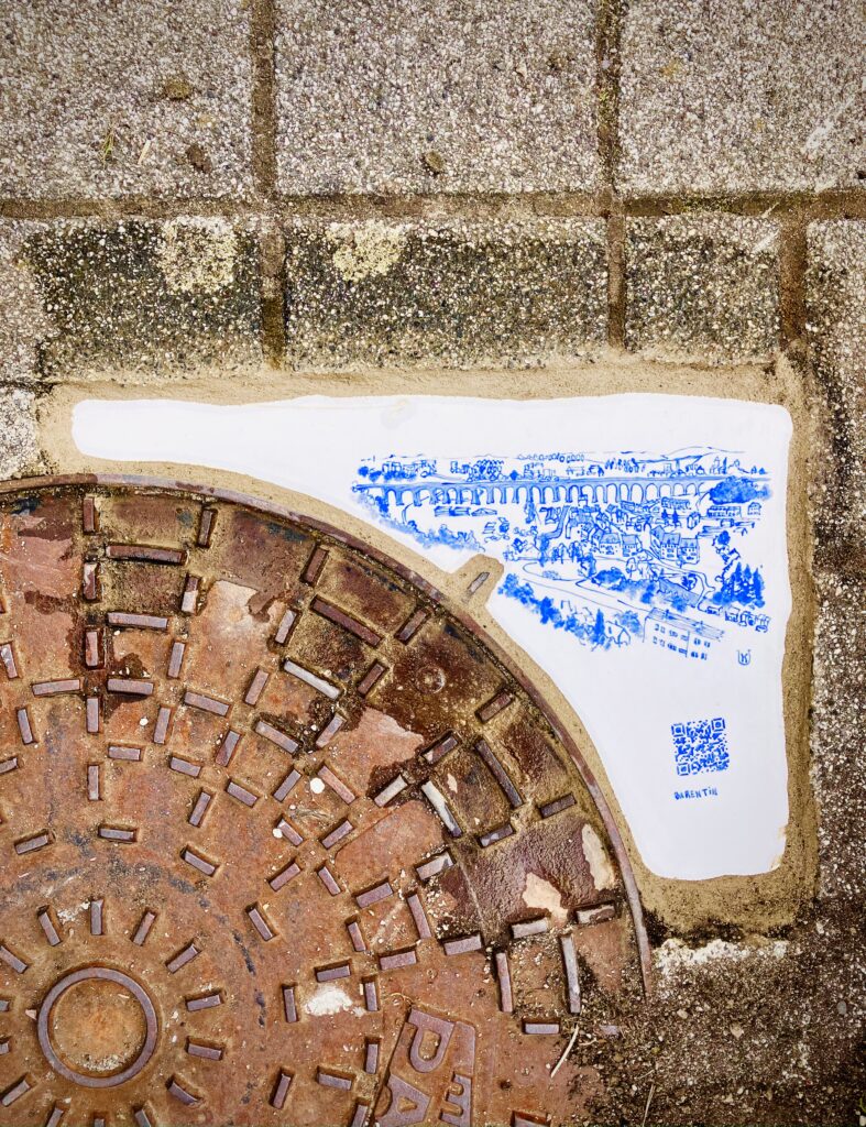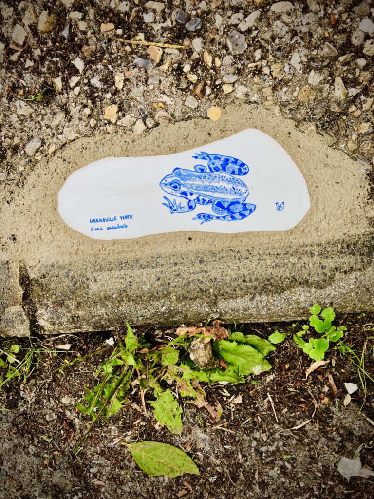 Artistic installation of ten tiles in the public space commissioned by the community of communes Caux Austreberthe for the Inspire festival: works of ceramics painted in blue, support stories to tell for the passers-by.